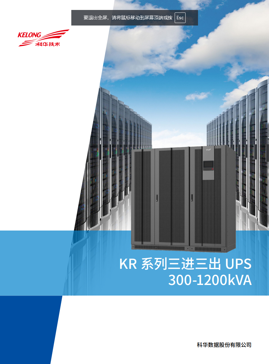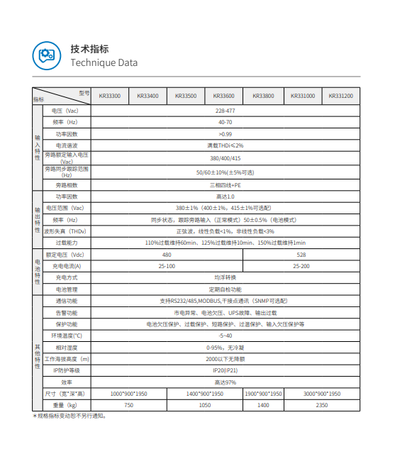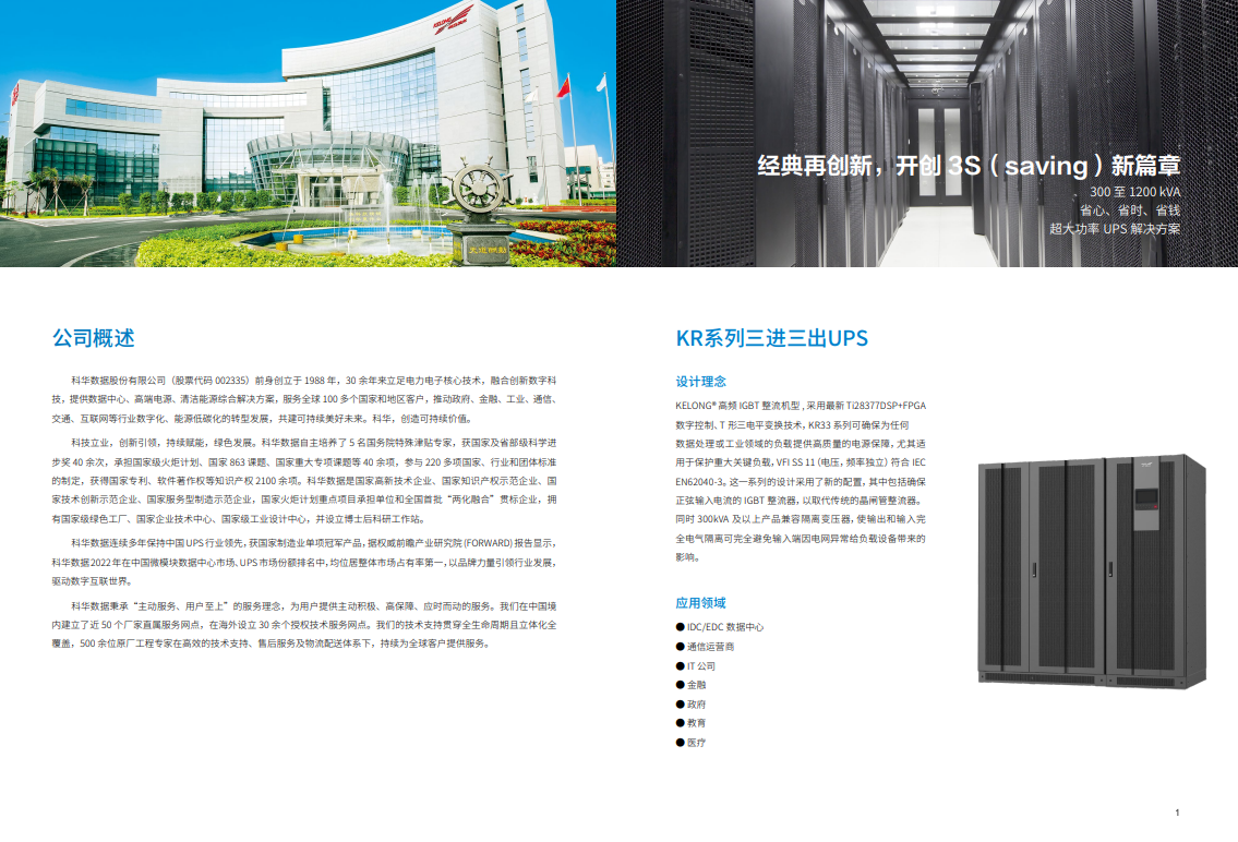 KELONG® 高频IGBT 整流机型, 采用最新Ti28377DSP+FPGA数字控制、三电平变换技术,KR33 系列可为数据中心或工业领域的负载提供高质量的电源保障,尤其适用于重大关键负载,VFI SS 11(电压,频率独立)符合IECEN62040-3。这一系列的设计采用了新的配置,包括确保正弦输入电流的IGBT 整流器,可取代传统的晶闸管整流器。同时300kVA 及以上产品兼容隔离变压器,可使输出和输入完全电气隔离,避免输入端电网异常给负载设备带来的影响。