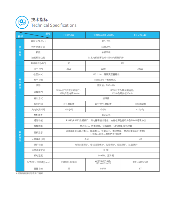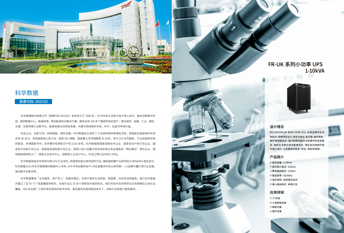 科华®FR-UK11系列小功率 UPS,采用全数字化控制技术、类模块化设计,具有功能全、高可靠、操作简单、维护便捷等优点,配以性能优越的功率器件和逆变模块、智能化多模式电池管理技术,满足恶劣电网环境的电力保护,为负载提供纯净、安全、稳定的电源。