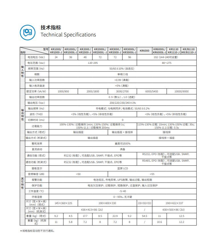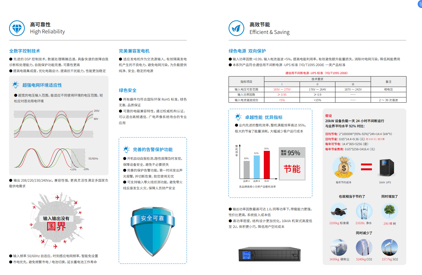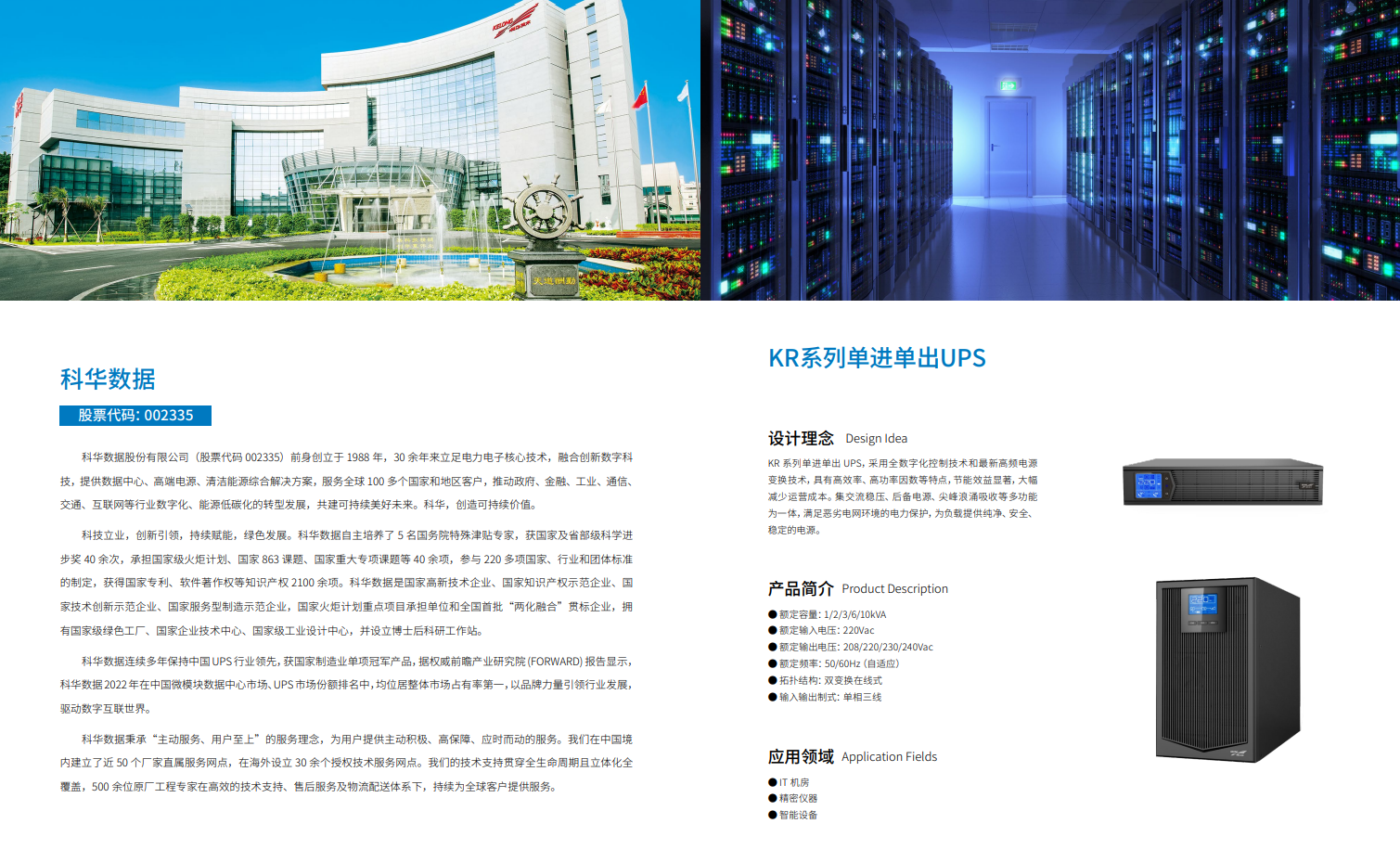 KR11系列单进单出 UPS,采用全数字化控制技术和最新高频电源变换技术,具有高效率、高功率因数等特点,节能效益显著,大幅减少运营成本。集交流稳压、后备电源、尖峰浪涌吸收等多功能为一体,满足恶劣电网环境的电力保护,为负载提供纯净、安全、稳定的电源。