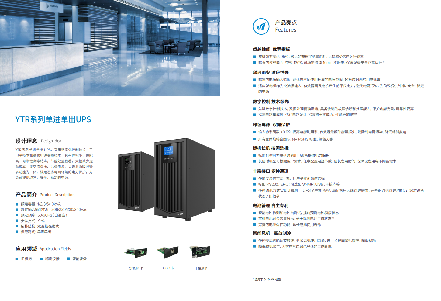 科华® YTR 系列单进单出 UPS,采用全数字化控制技术和最新高频电源变换技术,具有高效率、高功率因数等特点,节能效益显著,大幅减少运营成本。集交流稳压、后备电源、尖峰浪涌吸收等多功能为一体,满足恶劣电网环境的电力保护,为负载提供纯净、安全、稳定的电源。