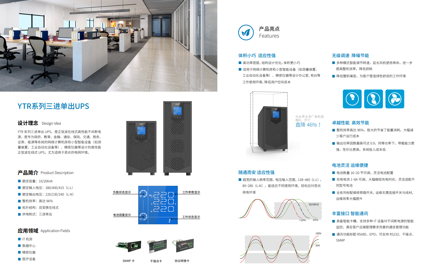 科华® YTR 系列三进单出UPS,是正弦波在线式高性能不间断电源,是专为金融、通信、保险、交通、税务、证券、能源、教育、政府、企业等系统的网络计算机房和小型智能设备(如测量装置、工业自动化设备等)、精密仪器等设计的高性能正弦波在线式 UPS,尤为适用于恶劣的电网环境。