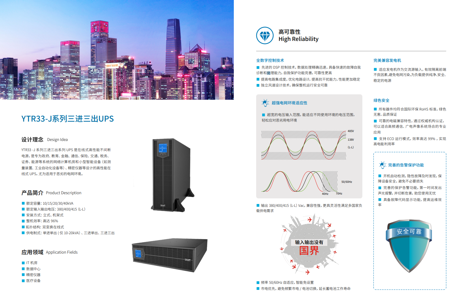 科华® YTR33-J系列 UPS 是在线式高性能不间断电源,是专为政府、教育金融、通信、保险、交通、税务、证券、能源等系统的网络计算机房和小型智能设备(如测量装置、工业自动化设备等)、精密仪器等设计的高性能在线式 UPS,尤为适用于恶劣的电网环境。