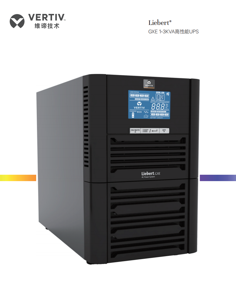 Vertiv Liebert GXE 系列 UPS 是基于 IT 行业交流不间断电源的应用动态,采用新拓扑,研发生产的全新一代塔式,单进单出,在线式高性能 UPS 产品。 通过突出性能及环保特性,满足中小机房IT类设备的最新应用,全面提升小功率段塔式 UPS 商业竞争力。