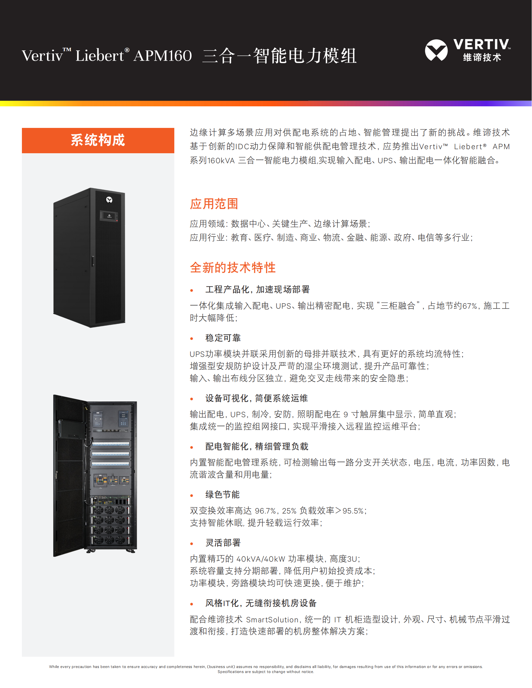 边缘计算多场景应用对供配电系统的占地、智能管理提出了新的挑战。维谛技术基于创新的IDC动力保障和智能供配电管理技术,应势推出Vertiv” Liebert APM系列160KVA 三合一智能电力模组,实现输入配电、UPS、输出配电一体化智能融合。