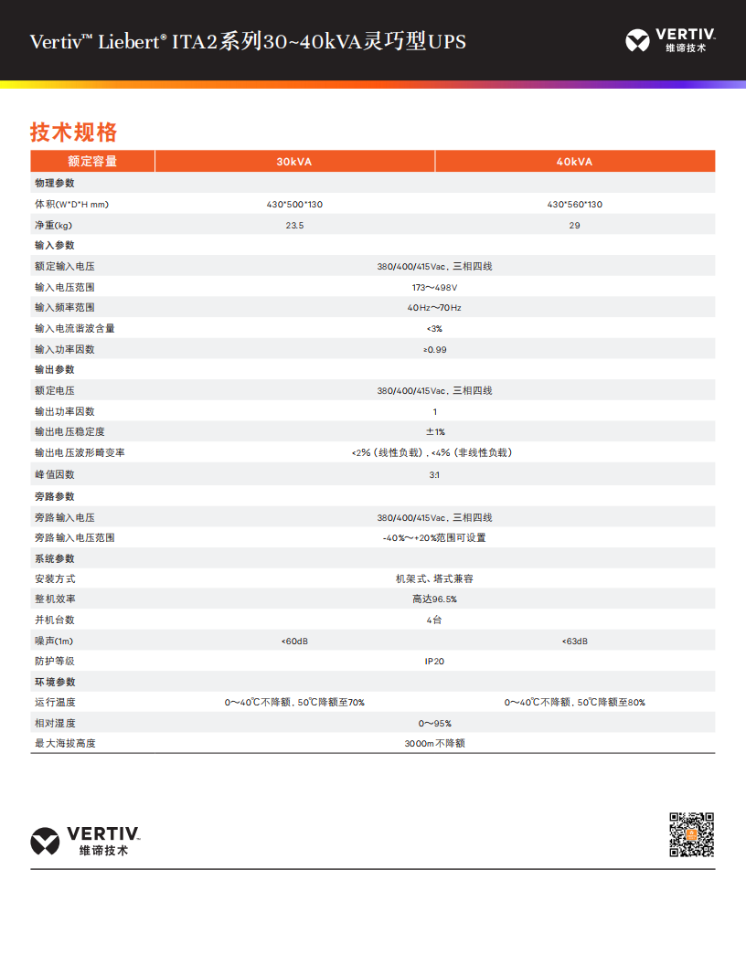 您的位置:首页 > 产品中心 > UPS电源产品中心 > 维谛USP电源 > Vertiv Liebert ITA2系列30~40KVA