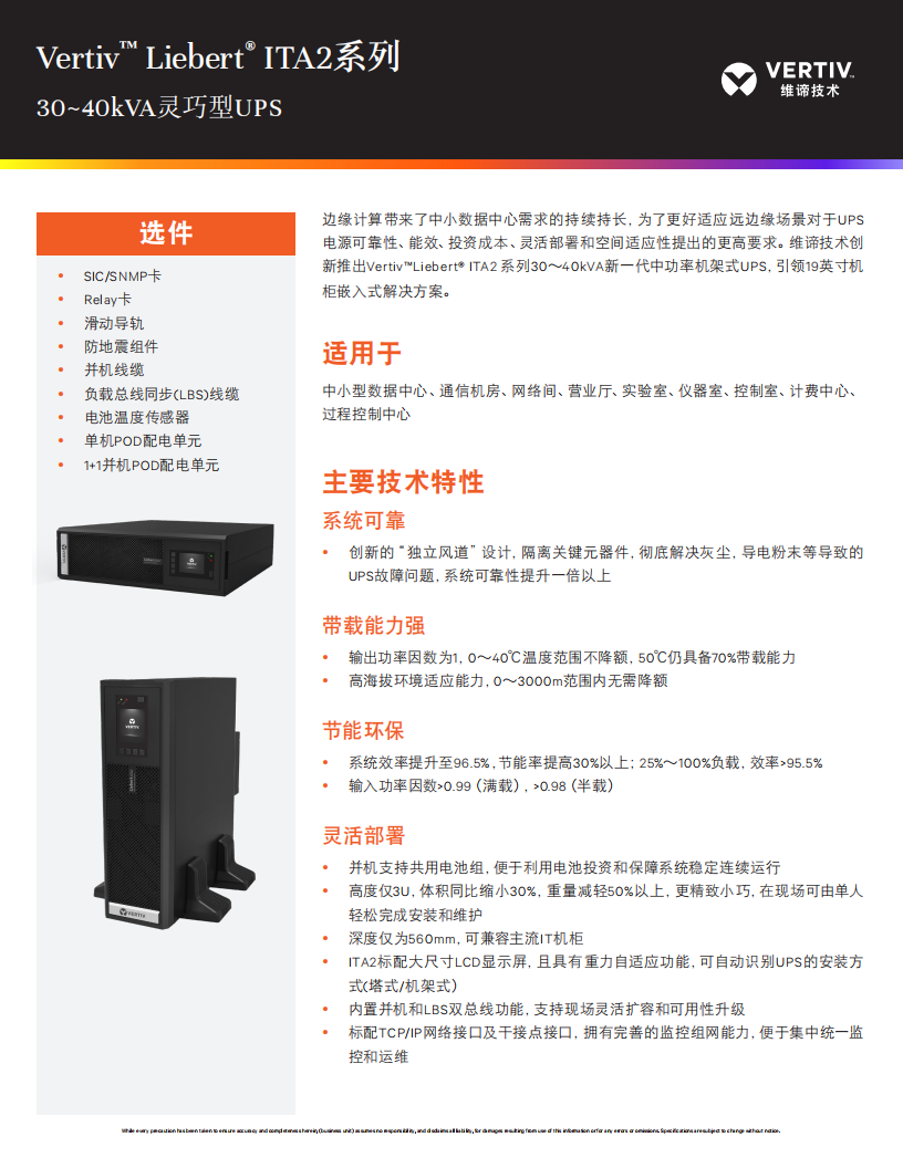边缘计算带来了中小数据中心需求的持续持长,为了更好适应远边缘场景对于UPS 电源可靠性、能效、投资成本、灵活部署和空间适应性提出的更高要求。维谛技术创新推出Vertiv""Liebert® ITA2 系列30~40KVA新一代中功率机架式UPS,引领19英寸机柜嵌入式解决方案。